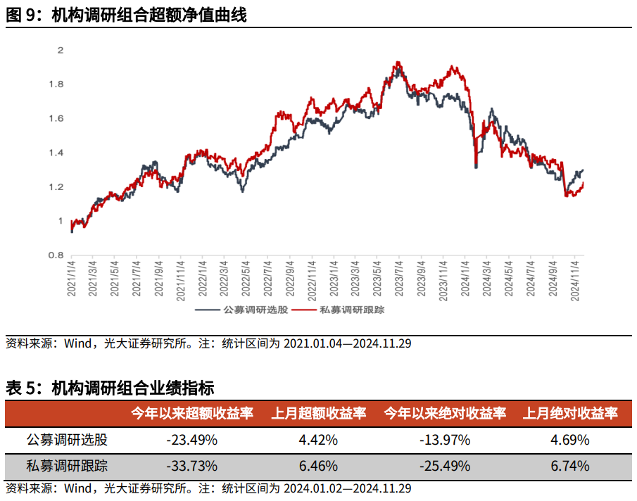 公募调研选股政策和私募调研追踪政策在11月份逾额收益较着。公募调研选股政策相对中证800获取逾额收益4.42%,私募调研追踪政策相对中证800获取逾额收益6.46%。