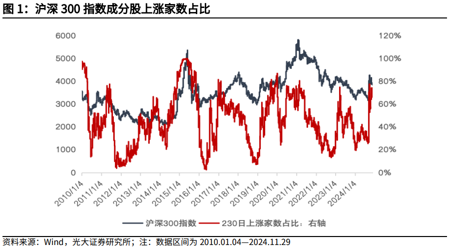 沪深300指数N日高涨学派占比 = 沪深300指数身分股畴昔N日收益大于0的个股数占比。