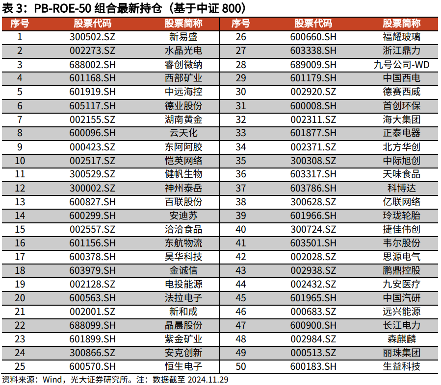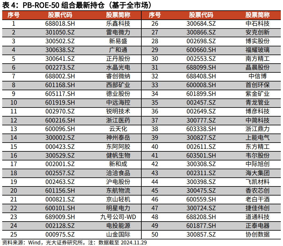 PB-ROE政策的中枢想想是寻找市鸠合的预期差,同期叠加超预期因子增强组合收益。咱们以Wilcox(1984)推导出的PB-ROE订价模子为基础得到预期差股票池,并选择SUE、ROE同比增长等因子精选50只股票构造出PB-ROE-50组合。(组合构造细目见附录)